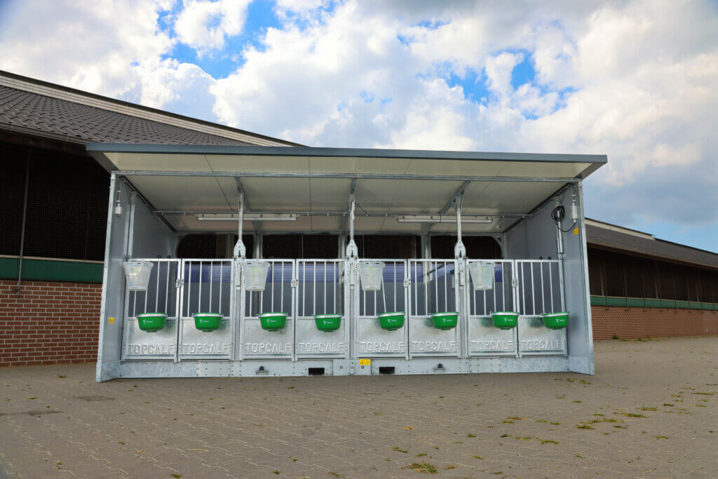 The Topcalf Quattro Calf Hutch is a mobile single-calf housing unit. With removable partitions, you can easily create a group of two or four, allowing the calves to grow up together and develop their social behavior. The construction—made of galvanized steel with plastic (removable) walls, removable slatted floors, and an insulated sandwich panel roof—is easy to clean and offers a long service life. With internal dimensions of (LxW): 1625×1000 mm per lying area, the calf hutch complies with current regulations.